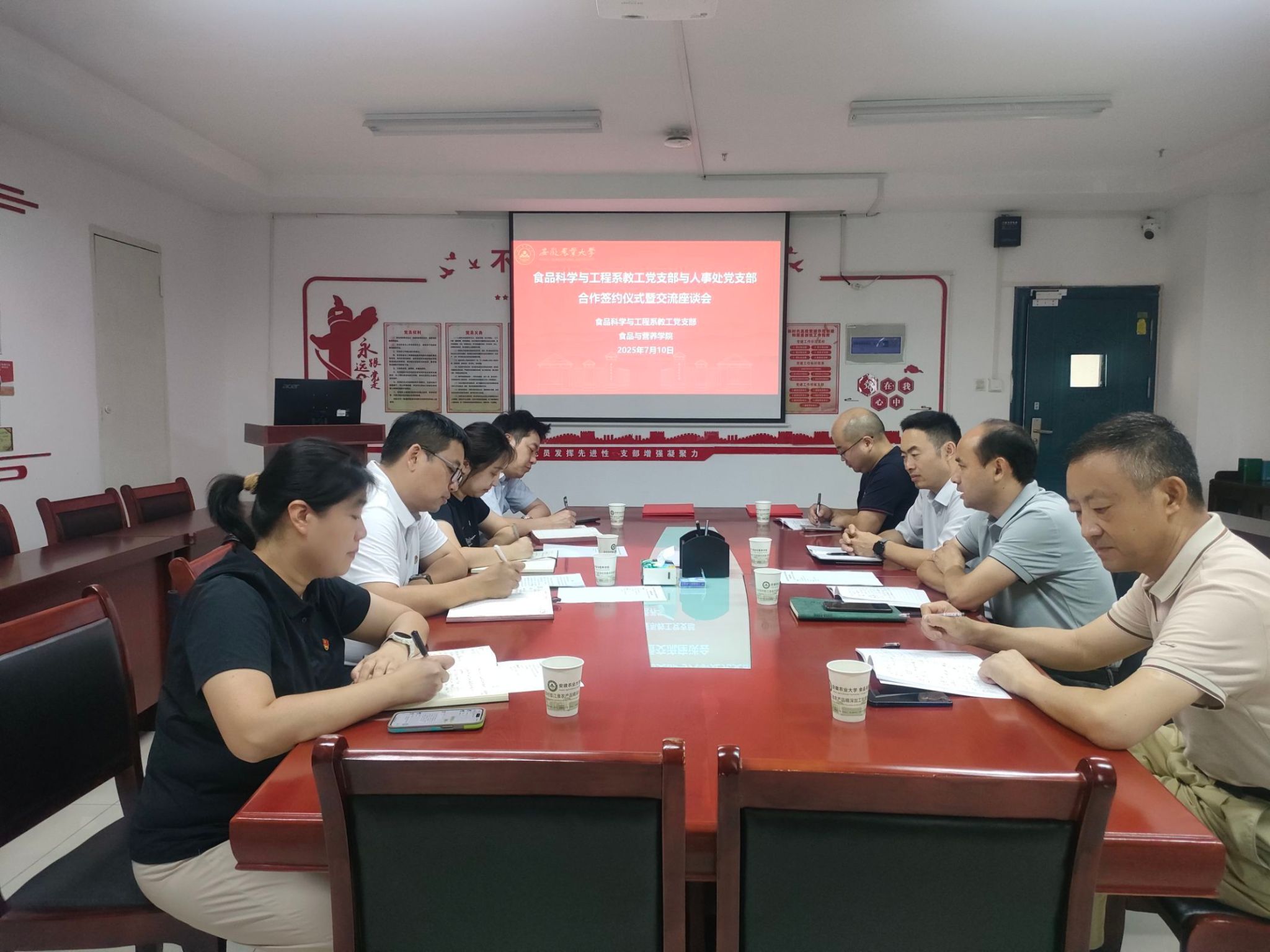 本网讯 为深入贯彻中央八项规定精神学习教育,创新基层党建工作载体,推进机关与学院深度交流、党建与业务深度融合,7月10日上午人事处党支部与食品科学与工程系教工党支部举行了结对共建签约仪式。人事处处长、党支部书记俞杰、食品与营养学院党委书记孙福和双方党支部党员出席了签约仪式,仪式由食品与营养学院副院长、食品科学与工程系教工党支部书记梁进主持。